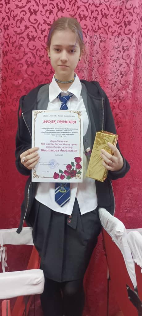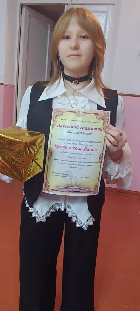 1 место – конкурс эссе «Мир без насилия» – ученица 8 А класса Куватпекова Даяна