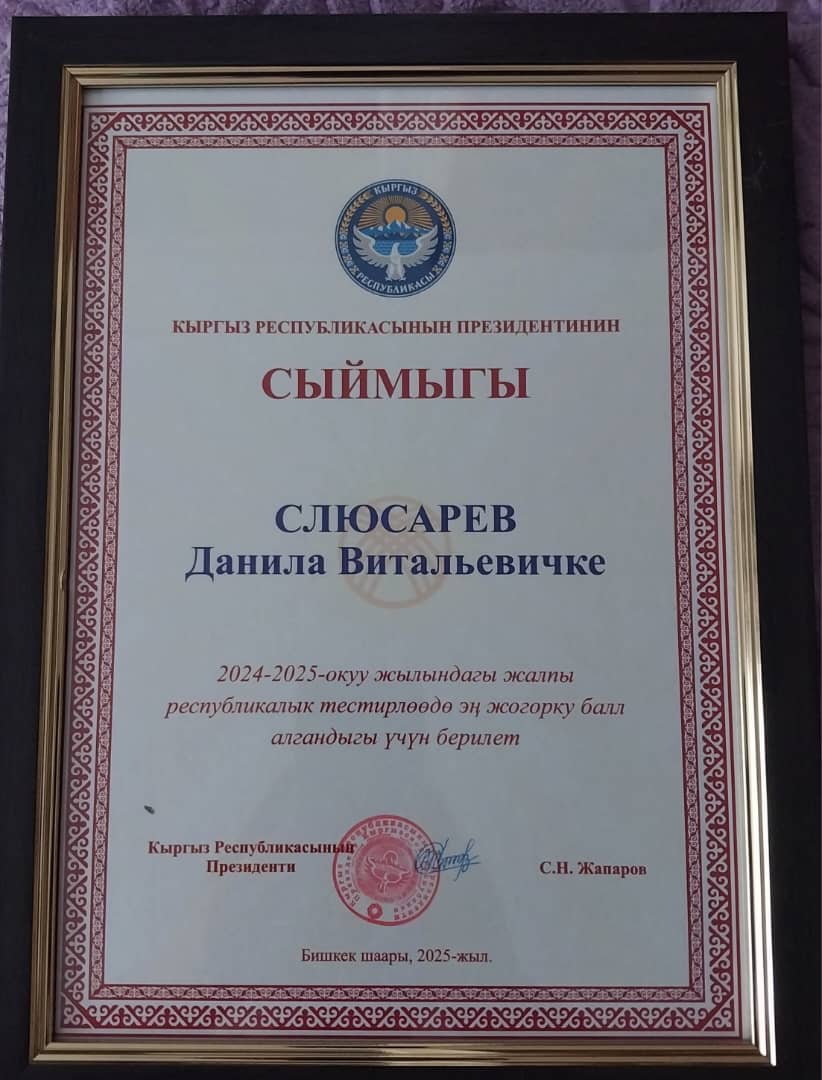 Среди этих учащихся был выпускник средней школы № 6 г. Кара-Балта Слюсарев Данила, который вошел в число лучших учеников Чуйской области.